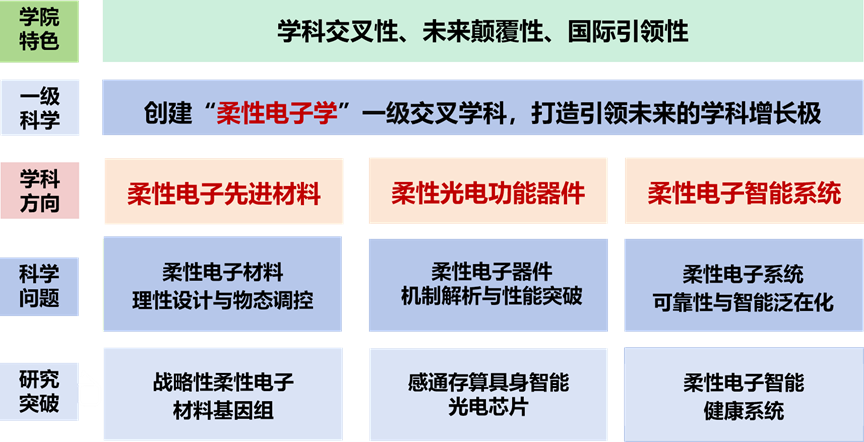 柔性电子作为高度交叉融合的颠覆性科技之一,是将有机、无机或有机无机复合(杂化)材料沉积于柔性基底上或以自体为支撑,形成以电路为代表的电子(光电子、光子)器件及其集成系统的一门新兴交叉科学与技术。学院将以 “柔性电子学”交叉学科,设置该学科硕士点与博士点,形成柔性电子学 “本-硕-博” 完整贯通的人才培养体系。以“柔性电子学”为核心打造引领未来电子信息技术的新学科增长极,促进学科交叉融合,催生学科新增长点,推动基础研究、技术开发和产业转化产学研一体化发展,形成面向国家重大需求跨学科、跨领域的新学科高地。